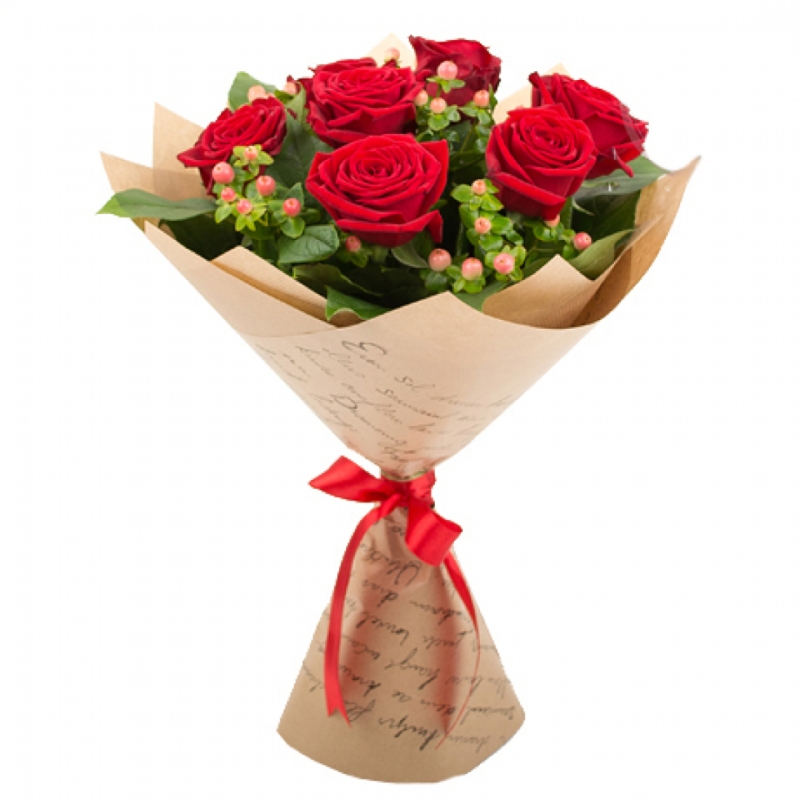 Букет состоит из 7 красных роз, 6 гиперикум, крафт, атласная лента.