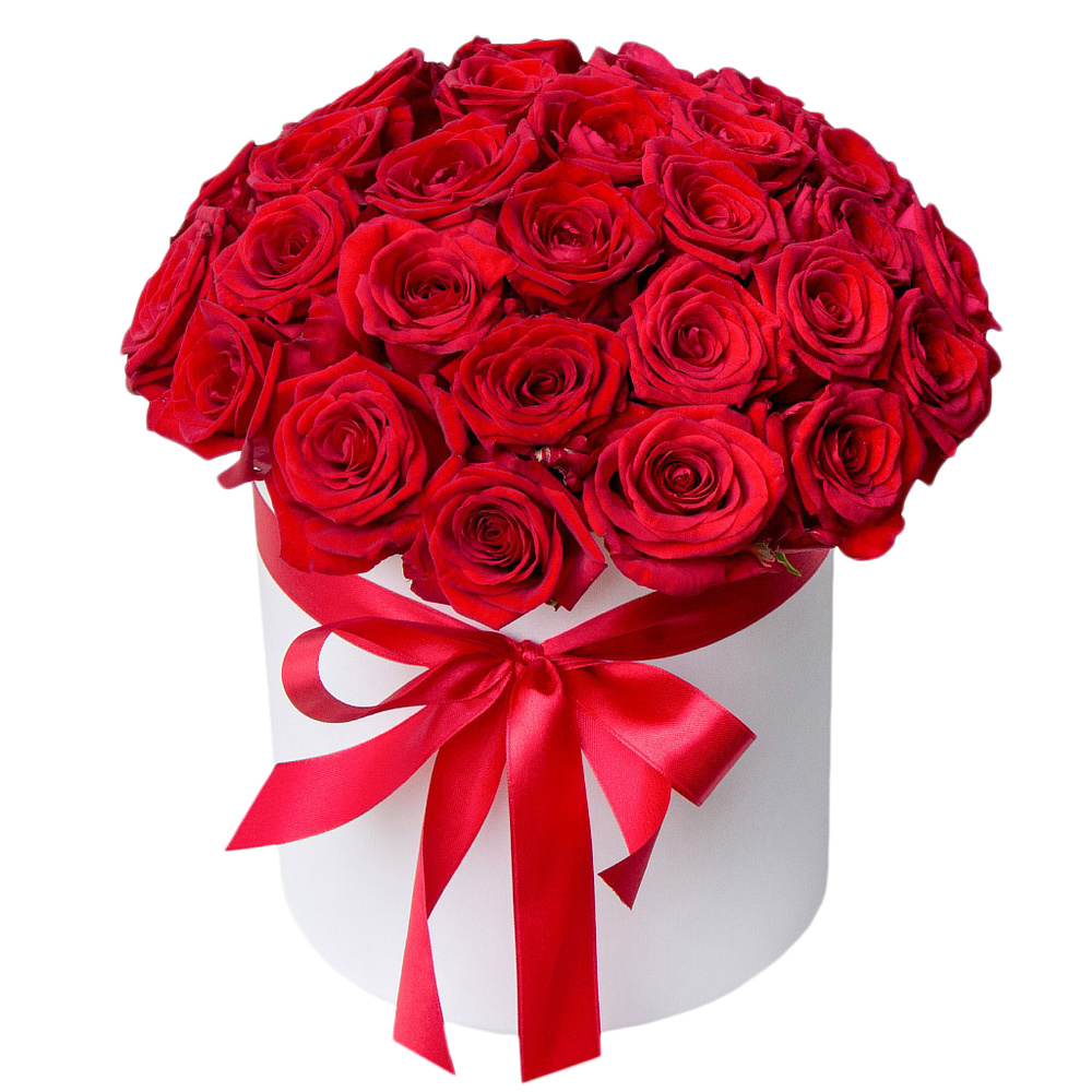35 красных роз, белая коробка, красная лента.