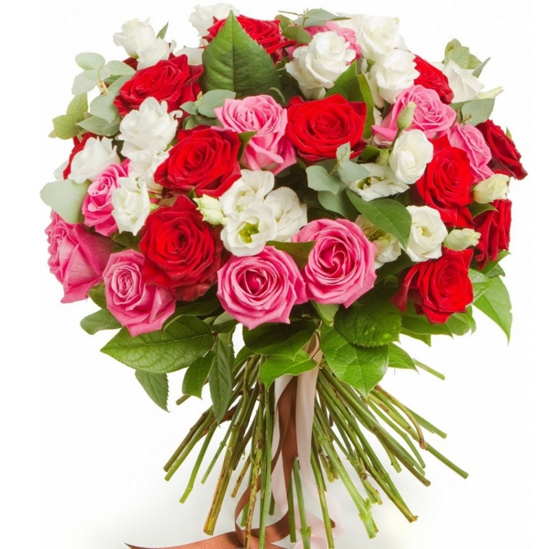 Букет состоит из 13 красных роз, 12 розовых роз, 10 веток эустомы, зелень, прозрачная упаковка, атласная лента.