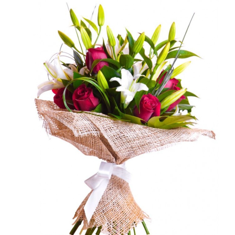 Букет состоит из 7 красных роз, 3 белых лилии, зелень, сетка, атласная лента.