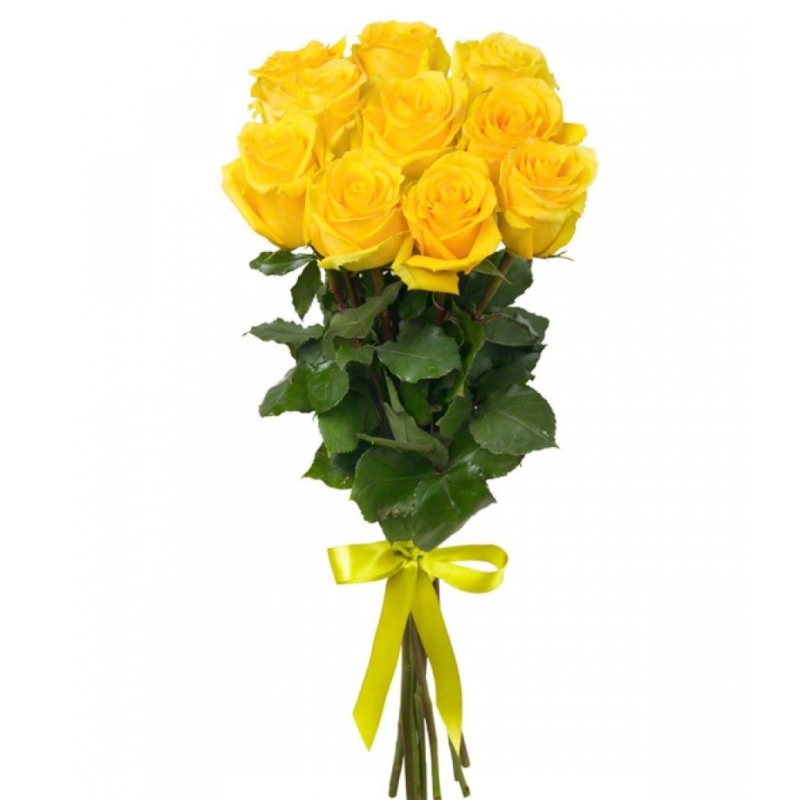 Букет состоит из 9 желтых роз, прозрачная упаковка, атласная лента.