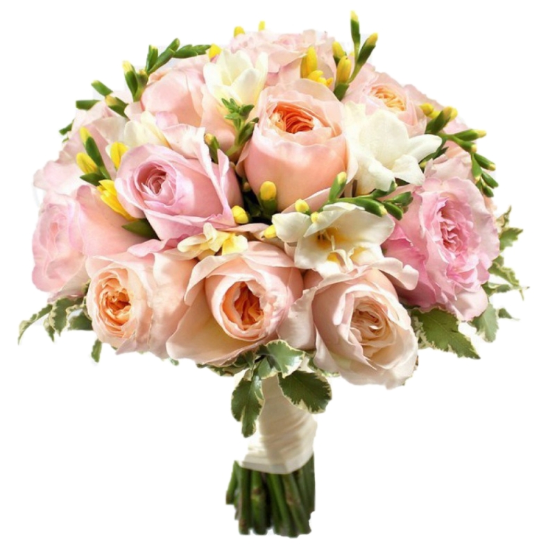 Букет состоит из 15 роз, 4 ветки фрезий, зелень, атласная лента.